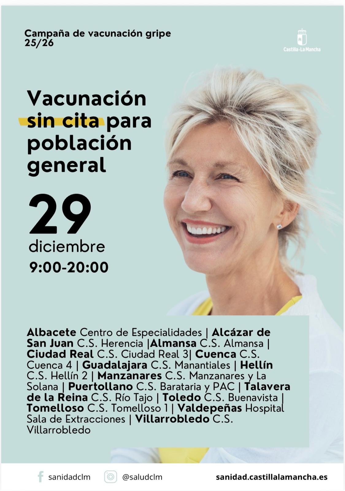 El Gobierno de Castilla-La Mancha pondrá a disposición de la ciudadanía, y exclusivamente este próximo lunes 29 de diciembre, 16 puntos de vacunación frente a la gripe en distintas partes de la geografía regional.