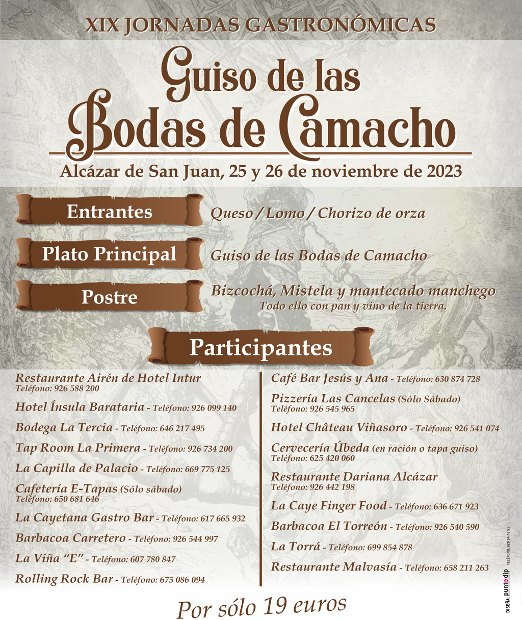 Organizada por la asociación La Sonrisa del Quijote y ASECEM esta cita con la mejor gastronomía cervantina se celebrará los días 25 y 26 de noviembre en más de una veintena de establecimientos hosteleros de Alcázar, quienes por un importe de 19 euros ofrecerán el menú típico de las Bodas de Camacho a base de queso manchego, lomo de orza y chorizos, el propio guiso con gallina y pelotillas, la tradicional bizcochá de Alcázar, mantecados, vino y mistela.