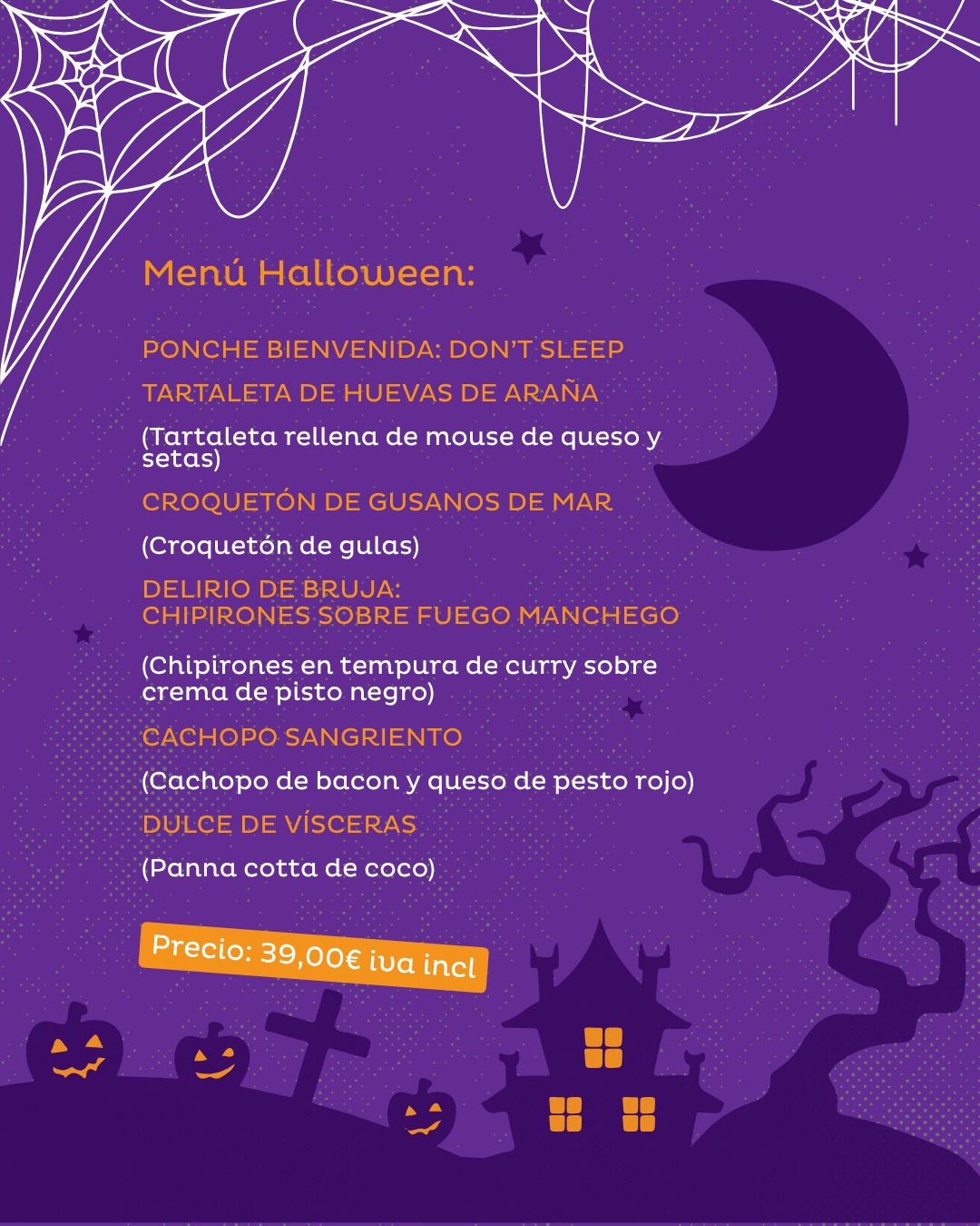 A continuación, exponemos el menú que ofrece el restaurante Airén del Hotel Intelier para esta noche terrorífica: