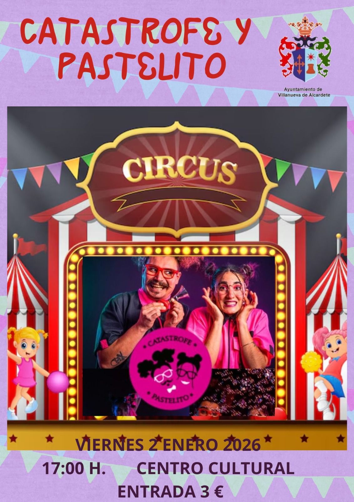 La Concejalía de Cultura del Ayuntamiento de Villanueva de Alcardete propone comenzar el año disfrutando del teatro en familia con la representación de la obra “Catástrofe y Pastelito”, una divertida propuesta dirigida al público familiar.