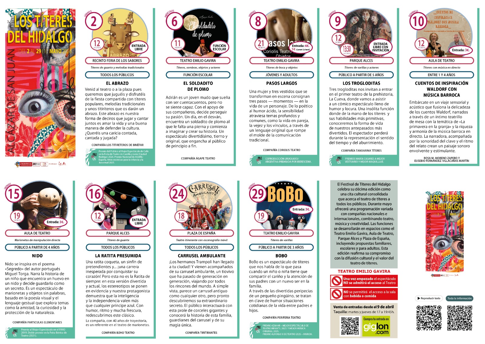 Asimismo, esta edición incorpora una política de precios accesible, con entradas que oscilan entre la gratuidad y los seis euros. Las entradas se encuentran disponibles en la taquilla del Teatro Emilio Gavira y en www.giglon.com . Toda la información sobre los espectáculos puede consultarse en X FESTIVAL -LOS TÍTERES DEL HIDALGO- Turismo y Cultura de Alcázar de San Juan