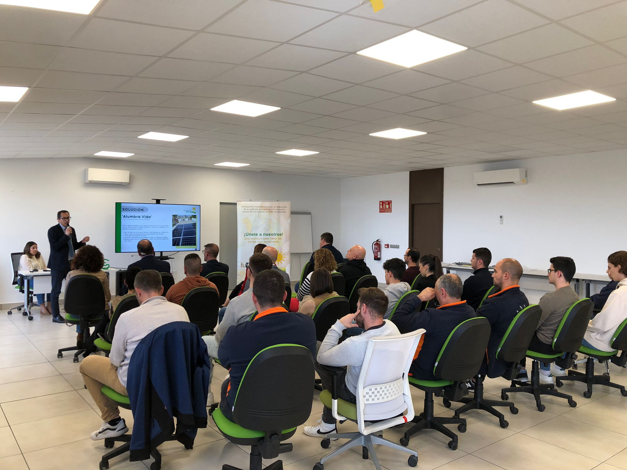 El Director de la Fundación GFM Renovables, Jesús Martínez, fue el encargado de conducir el acto, dando paso al testimonio de Javier Bustos, Director de Proyectos de la Fundación y el responsable de dirigir la instalación ‘in situ’, quien compartió con los presentes, tanto las características técnicas del proyecto como las adversidades a las que se enfrentaron para llevarlo a cabo. Tras él, Vicente Maqueda, Vicepresidente de la Fundación, también quiso intervenir, alabando el esfuerzo, la dedicación y el enorme trabajo que realiza la Fundación en este tipo de proyectos.