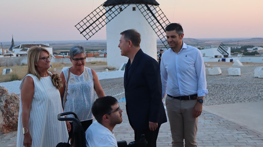 El presidente de Castilla-La Mancha, Emiliano García-Page, y el alcalde de Campo de Criptana, Santiago Lázaro. acompañados del vicepresidente regional José Manuel Caballero, la consejera portavoz, Blanca Fernández, la directora general de Turismo, Ana Fernández y otras autoridades regionales, provinciales y locales, ha inaugurado las obras de accesibilidad de la Sierra de los Molinos, así como el nuevo mirador.