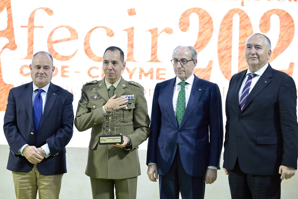 El presidente de Globalcaja, Mariano León, ha sido el encargado de entregar el premio a la Labor Social y Asistencial, un reconocimiento auspiciado por la Fundación Globalcaja y que en esta ocasión FECIR ha otorgado a la Unidad Militar de Emergencias (UME), servicio de las Fuerzas Armadas Españolas creado en 2005 y que han demostrado su eficaz intervención en catástrofes.