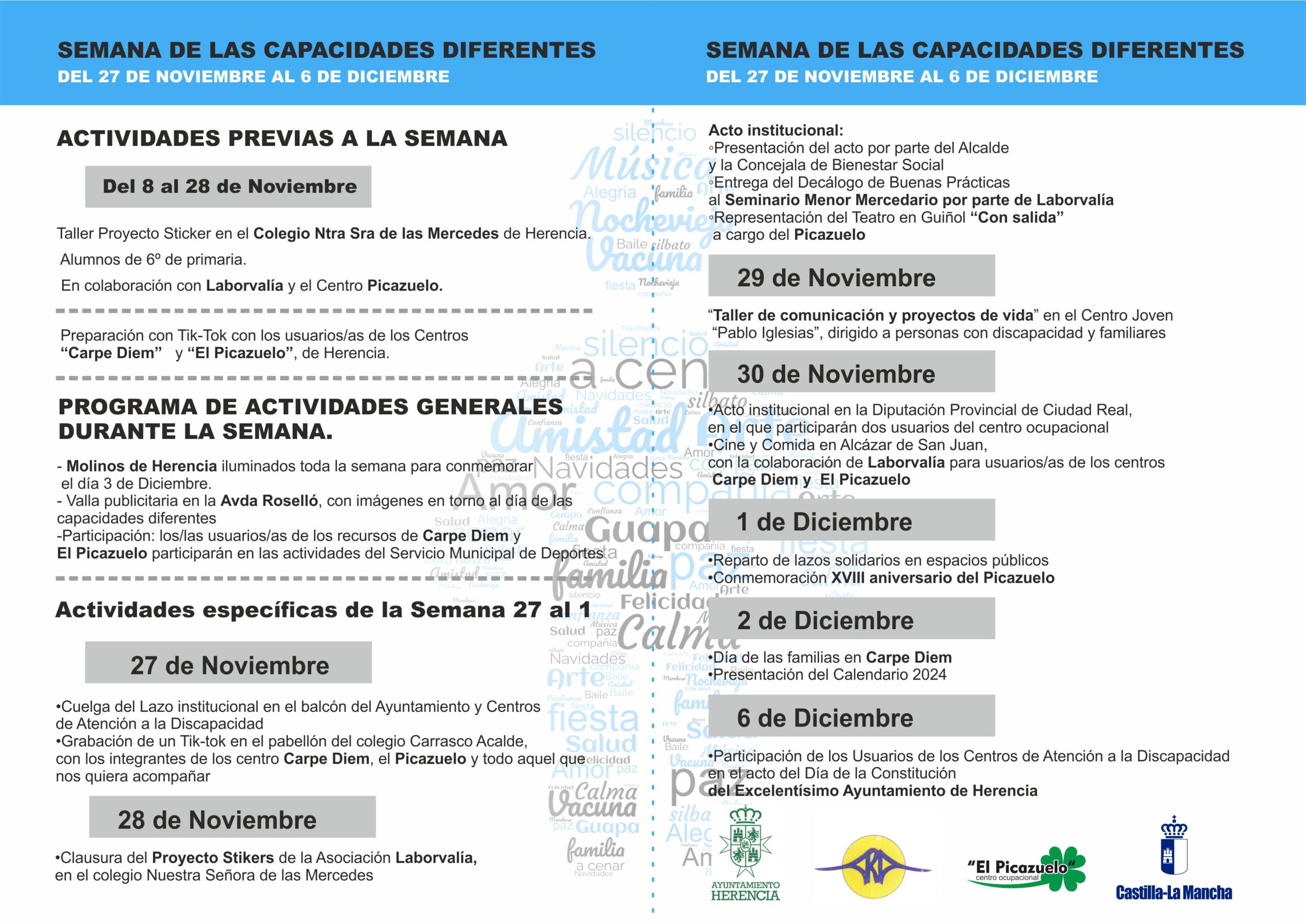 El próximo 3 de diciembre se conmemora el Día Internacional de las Personas con Discapacidad, una fecha para promover sus derechos y bienestar en todos los ámbitos de la sociedad, así como concienciar sobre su situación en todos los aspectos de la vida política, social, económica y cultural. Por este motivo, el Ayuntamiento de Herencia a través de los centros ‘El Picazuelo’ y ‘Carpe Diem’, en colaboración con Laborvalía, presenta un programa de actividades que se extenderá desde el 27 de noviembre al 6 de diciembre, con el objetivo de visibilizar y sensibilizar al resto de la población en cuanto a que las diferencias individuales, aportan valor añadido a la sociedad.
