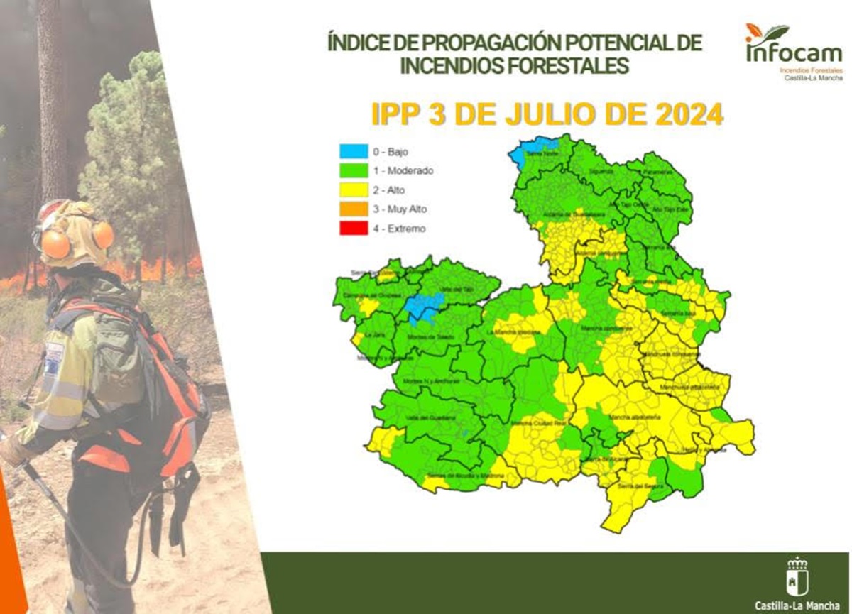 Previsión del Índice de Propagación Potencial de Incendios Forestales (IPP) para este 3 de julio de 2024 en Castilla-La Mancha.