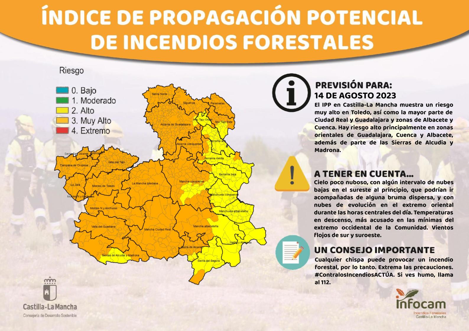 Índice de Propagación Potencial de Incendios Forestales (IPP) para mañana 14 de agosto de 2023 en Castilla-La Mancha.