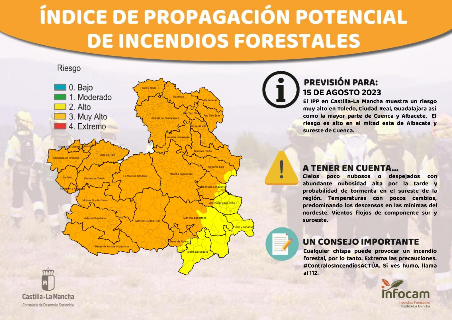 Previsión del Índice de Propagación Potencial de Incendios Forestales (IPP) para mañana 15 de agosto 2023 en Castilla-La Mancha.