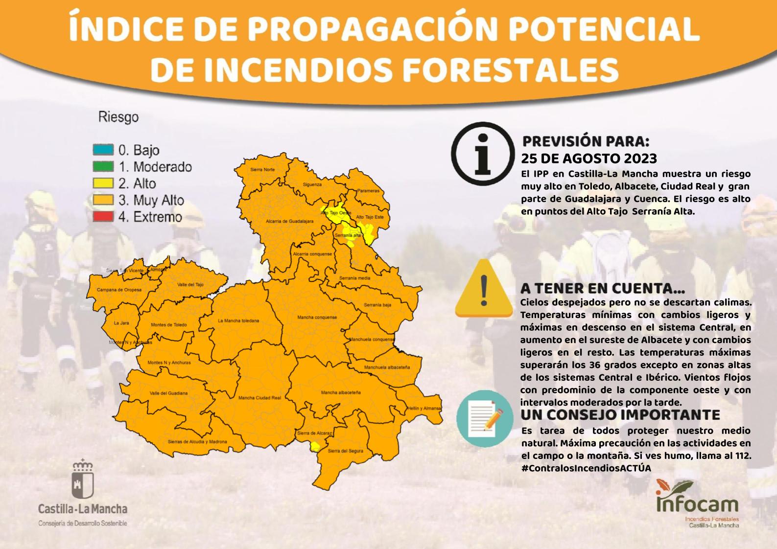 Índice de Propagación Potencial de Incendios Forestales (IPP) para mañana 25 de agosto 2023 en Castilla-La Mancha.