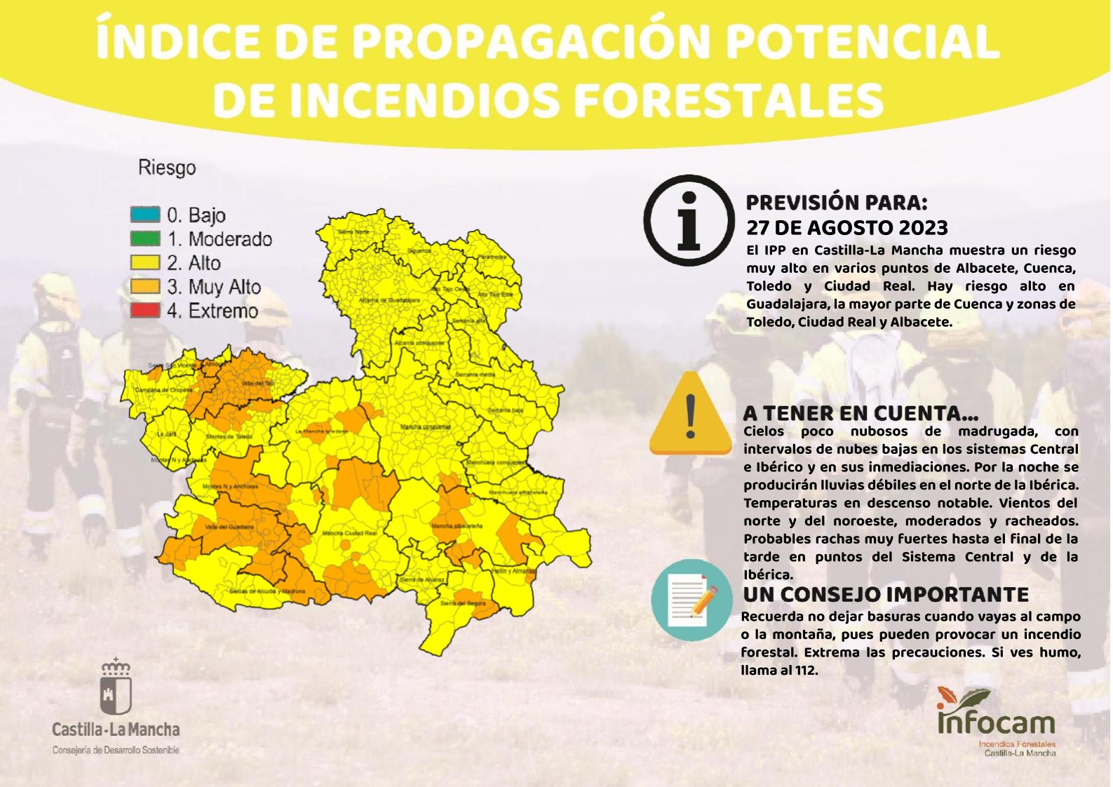 Índice de Propagación Potencial de Incendios Forestales (IPP) para mañana 27 de agosto de 2023 en Castilla-La Mancha.