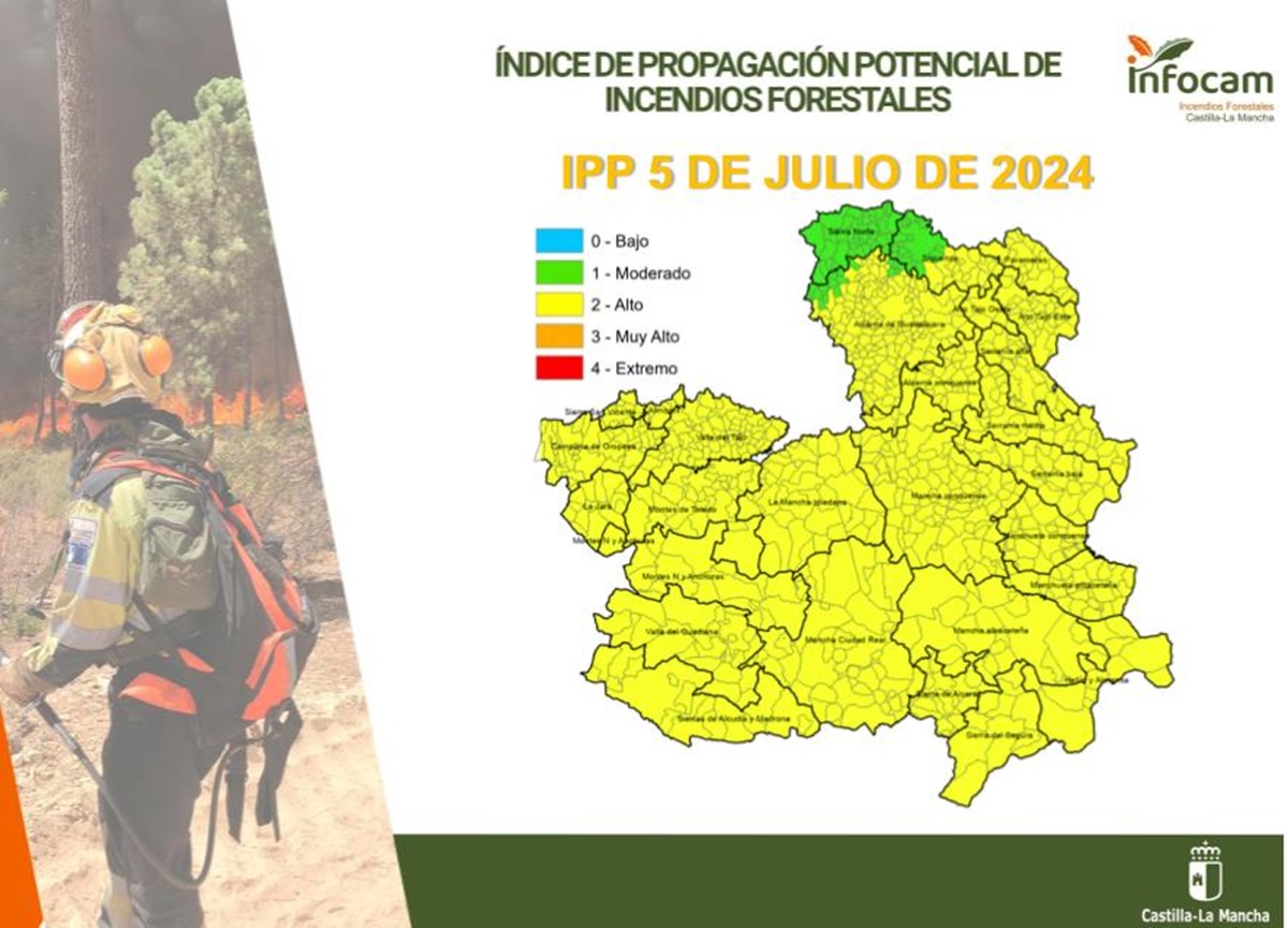 Índice de Propagación Potencial de Incendios Forestales previsto para el 5 de julio de 2024 en Castilla-La Mancha: