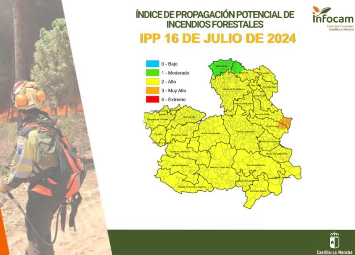Índice de Propagación Potencial de Incendios Forestales previsto para el 16 de julio de 2024 en Castilla-La Mancha:
