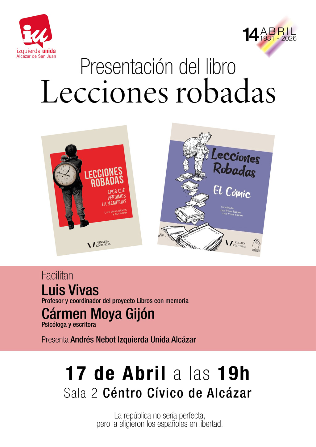 Izquierda Unida (IU) y el Partido Comunista de España (PCE) de Alcázar de San Juan han organizado varios actos de memoria histórica con motivo del 14 de abril, fecha vinculada a la proclamación de la Segunda República. Las actividades pretenden recordar a las personas que perdieron la vida por defender la democracia y las libertades, así como reivindicar la importancia de preservar la memoria histórica.