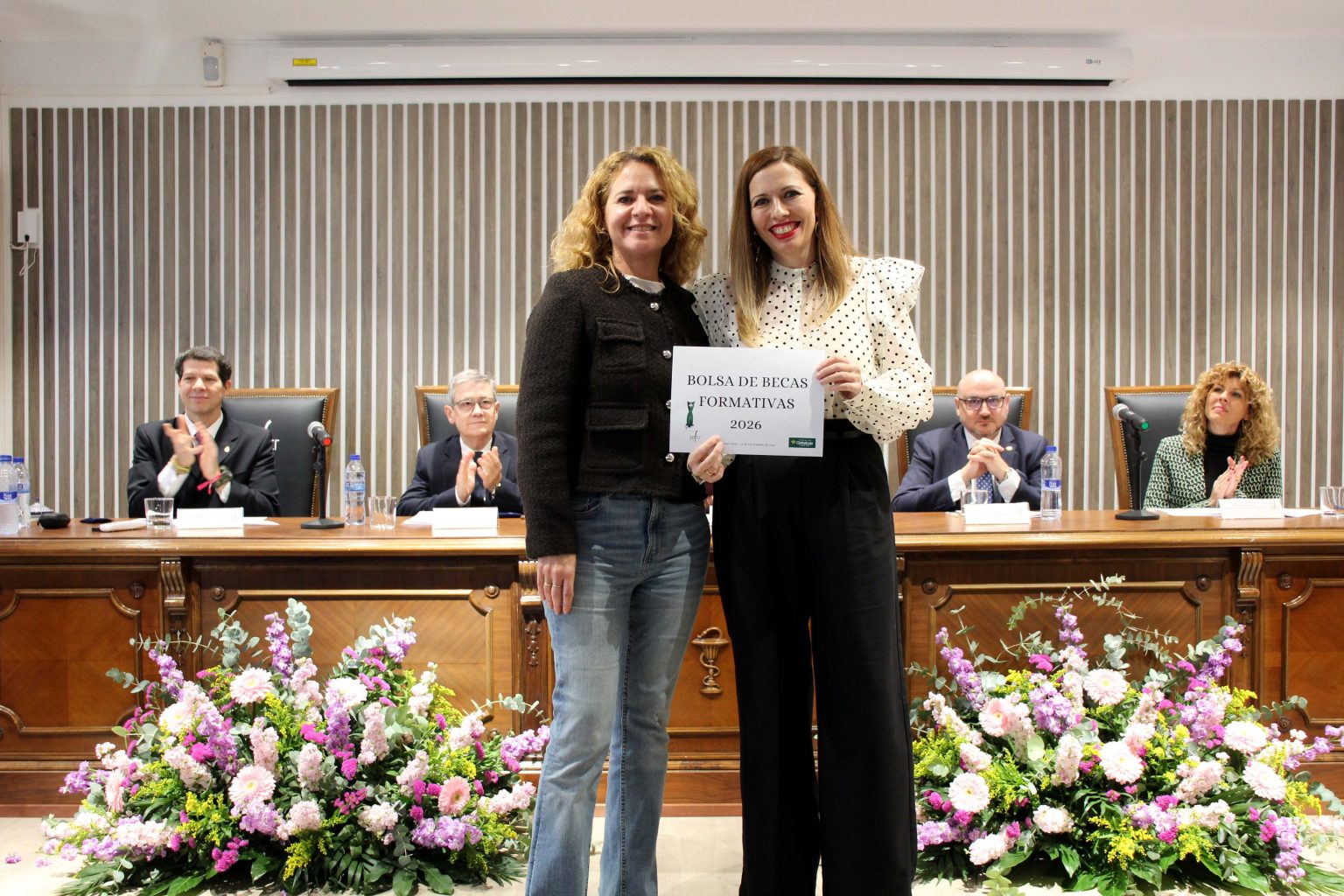 La coordinadora de Formación del COF, la vocal Laura Quintana, recogió también un cheque de Fundación Globalcaja, que irá destinado a becas de formación en 2026, de manos de Maite Carmona.