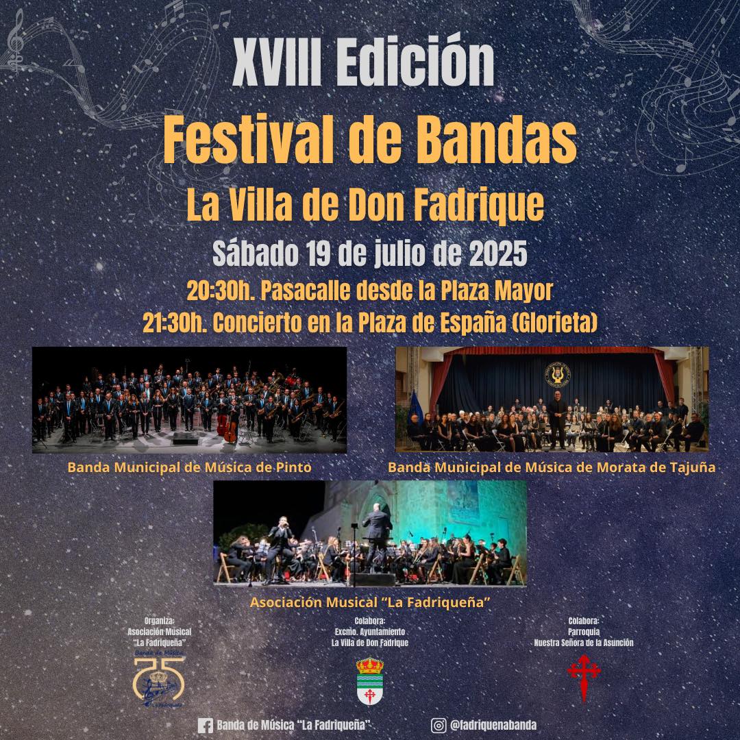La Banda de Música «La Fadriqueña» arrancará el 25 aniversario de su fundación con la celebración de la XVIII edición del Festival de Bandas de La Villa de Don Fadrique, que se celebrará el próximo sábado 19 de julio en la Plaza de La Glorieta a partir de las nueve y media de la noche. El evento arrancará una hora antes con el desfile por las calles de la localidad junto a las dos bandas invitadas con salida en la Plaza Mayor. Este evento está enmarcado dentro de la programación del Verano Cultural que ha organizado la Concejalía de Cultura y Festejos del Ayuntamiento fadriqueño.