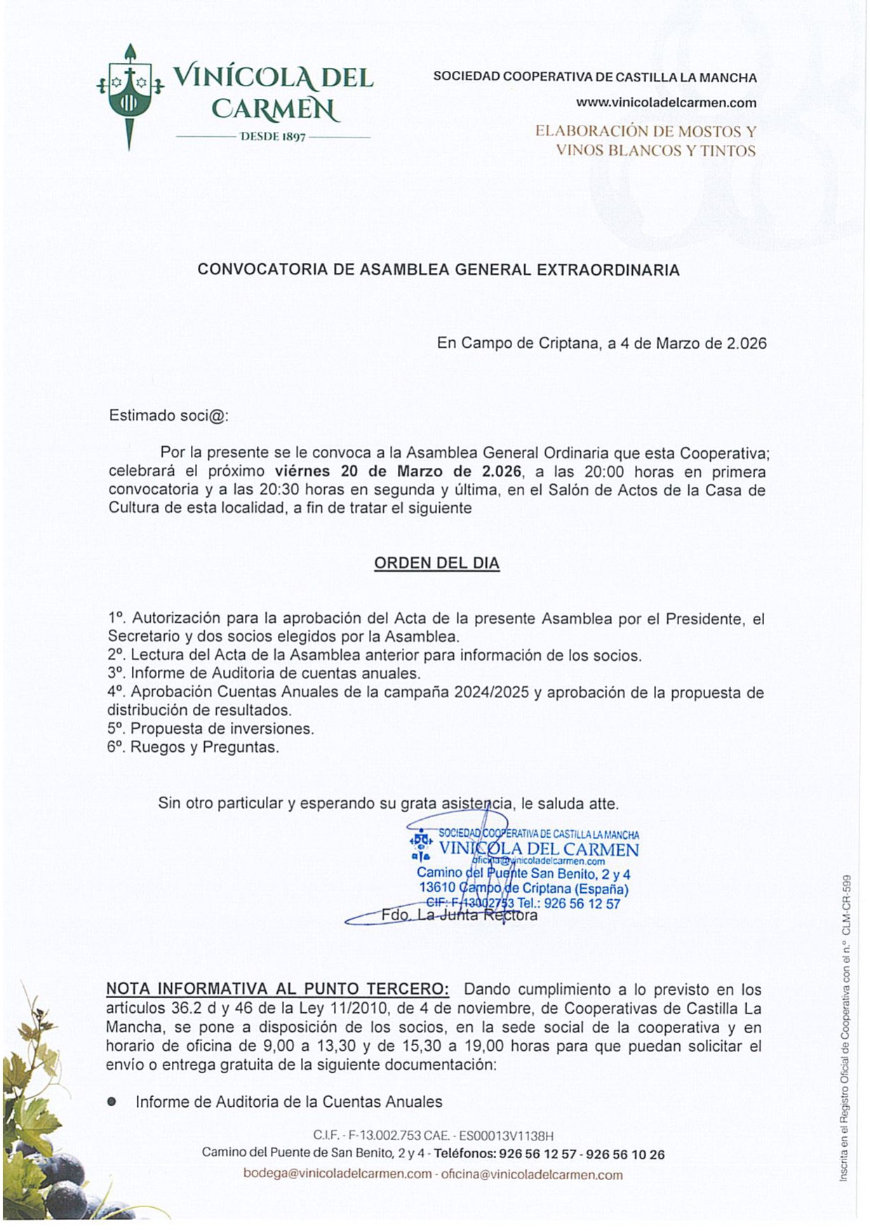 La Sociedad Cooperativa de Castilla-La Mancha Vinícola del Carmen ha convocado a sus socios a la Asamblea General Ordinaria que se celebrará el próximo 20 de marzo de 2026 en el Salón de Actos de la Casa de Cultura de Campo de Criptana.