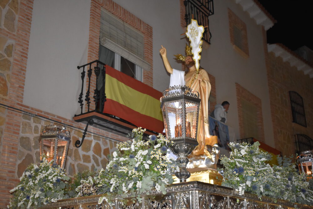 De forma paralela, la imagen de Jesús Resucitado, llevada a costal por la Cofradía de las Tres Marías, iniciaba su recorrido desde el Templo Parroquial, arropada por los estandartes de Jesús y por la Agrupación Musical Las Tres Marías.