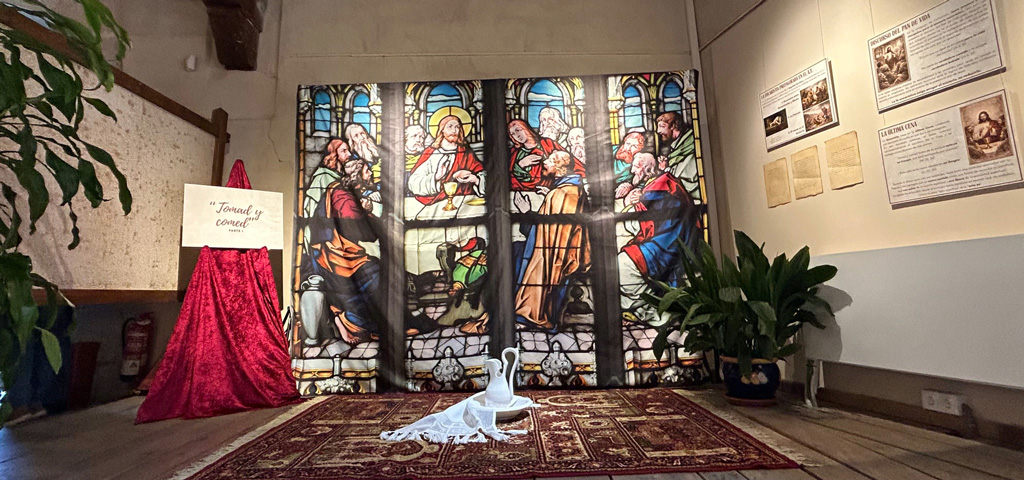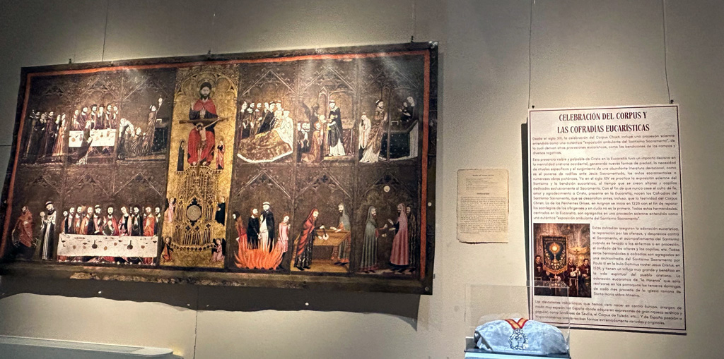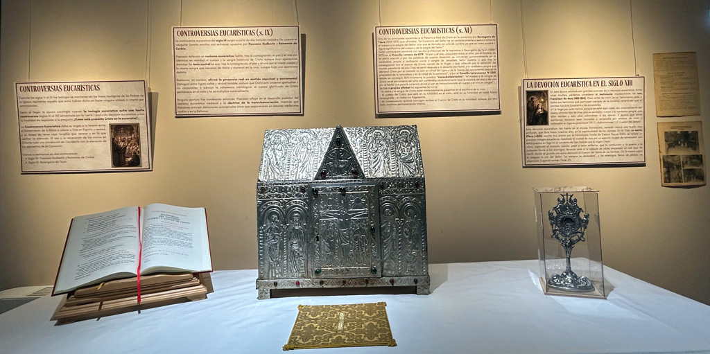 El recorrido comienza con Tomad y comed, un espacio dedicado a la Eucaristía en la Sagrada Escritura, desde el Antiguo Testamento hasta los Evangelios. A continuación, Venid y adorad aborda la tradición de la Iglesia primitiva y las controversias teológicas surgidas en torno a la presencia real de Cristo en la Eucaristía, así como la respuesta de la Iglesia a través de concilios y sínodos. En este apartado se exhiben también enseres litúrgicos y piezas de orfebrería, como cálices y copones, que reflejan la evolución del culto eucarístico.