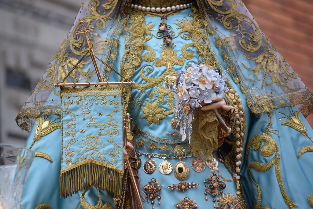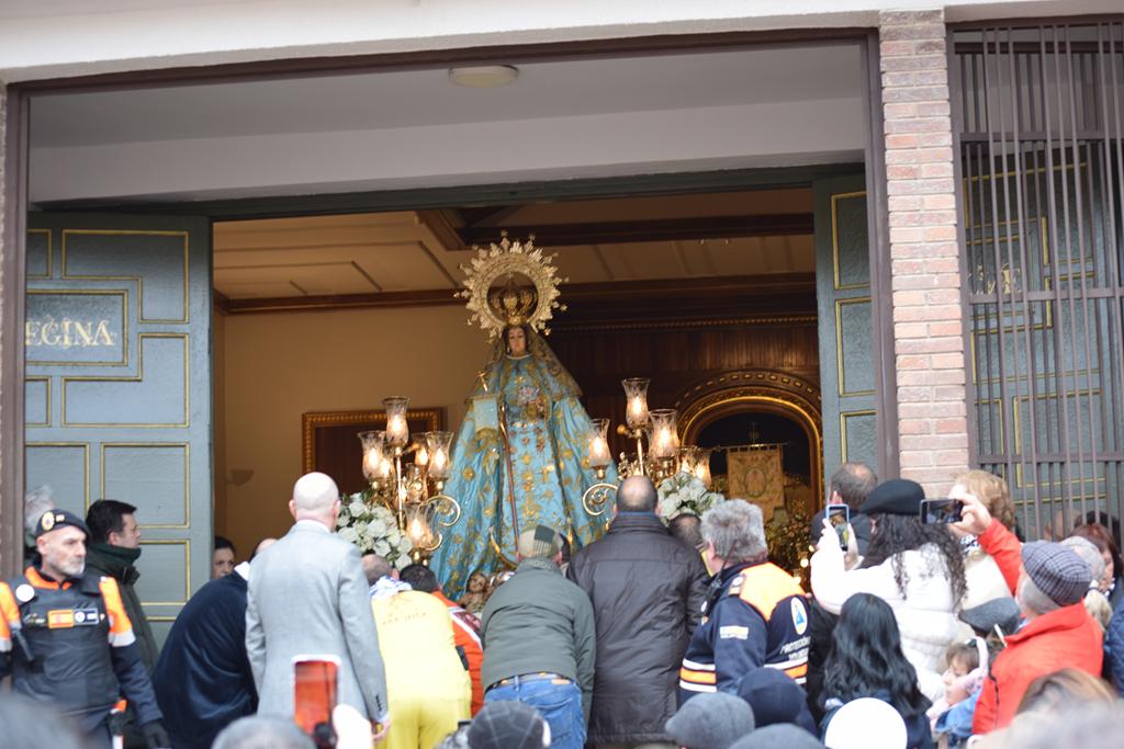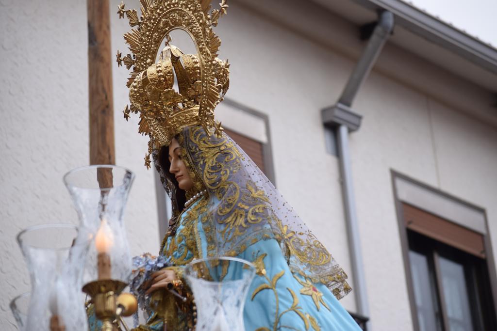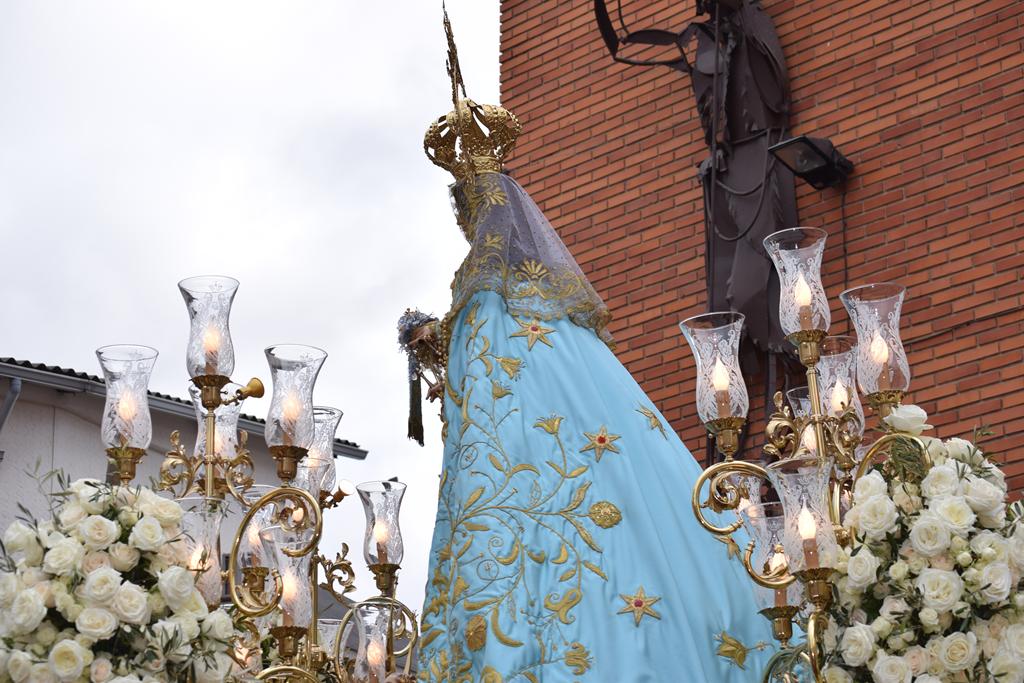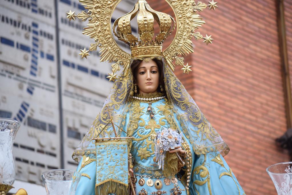 La imagen de la patrona salió en procesión alrededor de la una menos cuarto de la tarde desde la iglesia de San Juan Bautista, acompañada por vítores y el estruendo de los cohetes lanzados por las 30 peñas coheteras que precedían al cortejo, una de las señas de identidad más reconocibles de esta celebración.