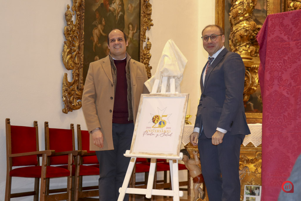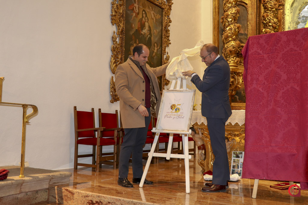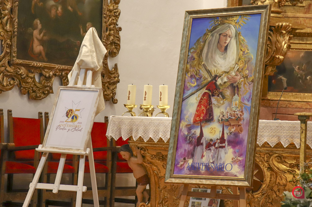 Durante el acto se descubrió el logotipo del 25 aniversario, obra del artista José Manuel Vega, quien explicó que se trata de una reinterpretación del emblema de la Hermandad adaptado a la efeméride. La Cruz de San Juan se sitúa en el centro, acompañada del número 25, cuyos dígitos integran los símbolos de los titulares: el “2”, dedicado a Jesús del Perdón, muestra la silueta del Señor con la cruz; el “5”, dedicado a la Virgen, incorpora la silueta mariana en su característico color azul.