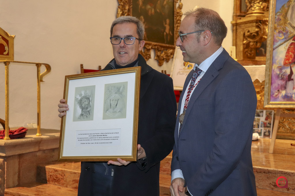El acto concluyó con varios reconocimientos: al párroco de Santa María, Javier Quevedo, por su acompañamiento y apoyo a lo largo de estos años; al Ayuntamiento de Alcázar de San Juan por su colaboración permanente; y, de forma especialmente emotiva, a los fundadores que hace 25 años iniciaron esta Hermandad que hoy sigue creciendo con devoción, compromiso y unidad.