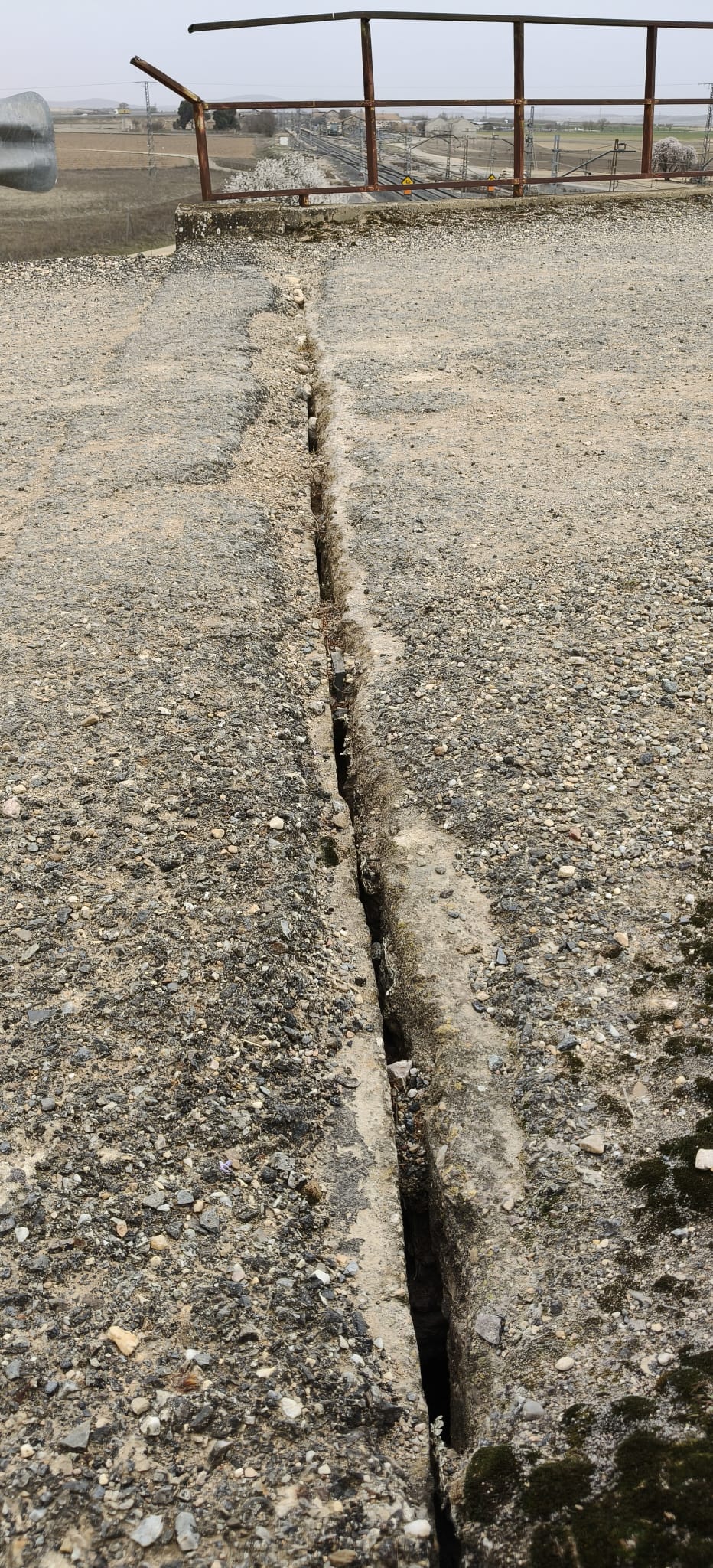 Todo Tembleque publica fotografías recientes, en las que puede observarse como se ha abierto el suelo, tras años empeorando, en lo alto del puente del camino Palomas, con el enorme riesgo que ello puede suponer, al estar el mallazo del forjado al aire.