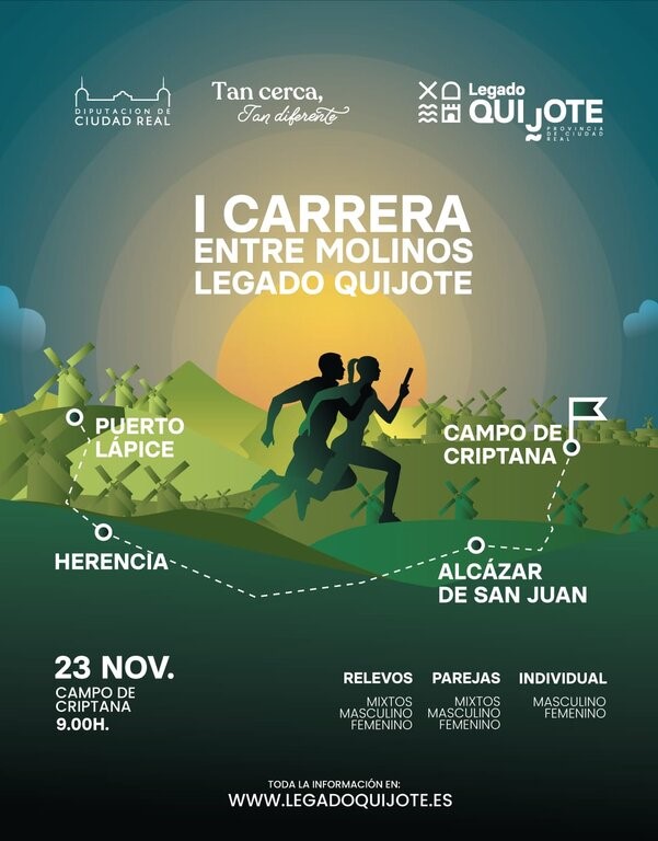 La Mancha volverá a convertirse en escenario de hazaña y compañerismo con la primera carrera por relevos “Legado Quijote”, una cita deportiva y cultural que se celebrará el 23 de noviembre entre los icónicos molinos de Puerto Lápice, Herencia, Alcázar de San Juan y Campo de Criptana. La iniciativa, promovida por la Diputación de Ciudad Real dentro del programa “Legado Quijote”, pretende combinar deporte, patrimonio y solidaridad en un recorrido único por la llanura manchega.
