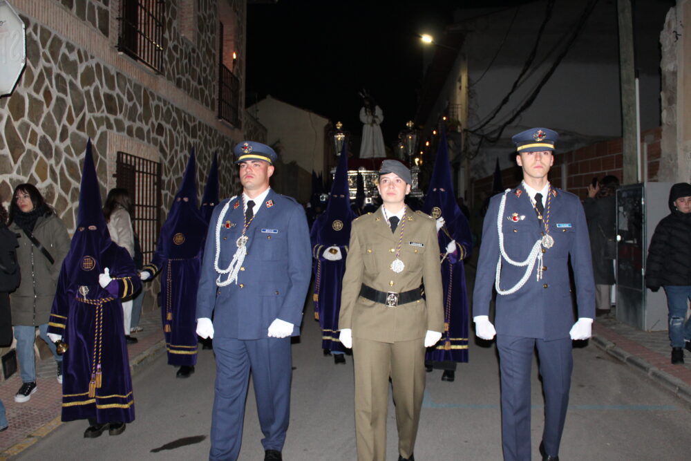 El sonido de las campanas que portaban los nazarenos rompía el silencio de la madrugada, creando una atmósfera única. A ello se sumaba la interpretación de música de capilla por parte de algunos componentes de la Banda Sinfónica Municipal, que aportaban aún más solemnidad al recorrido.