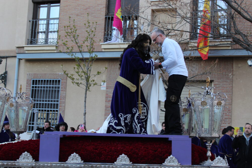 En el cortejo también participaban el Párroco de la localidad junto a miembros de la Junta de Cofradías y de la Hermandad. Al llegar a la Plaza del Ayuntamiento, la imagen se detenía para encontrarse con el paso de Jesús ante Pilatos, de la Cofradía del Santo Descendimiento. En ese momento, Zacarías López-Barrajón leía la sentencia que condenaba a Jesús a muerte. Tras ello, los miembros de la Cofradía del Nazareno cambiaban la túnica blanca por una morada, colocaban la corona de espinas y la cruz, marcando el inicio de un nuevo tramo procesional.