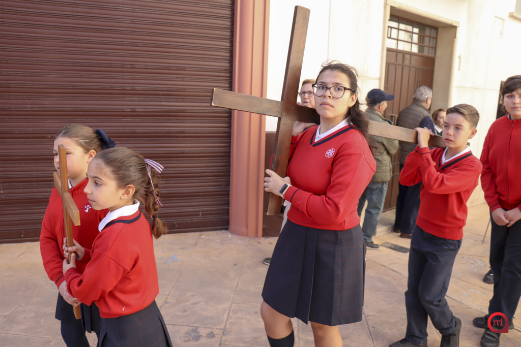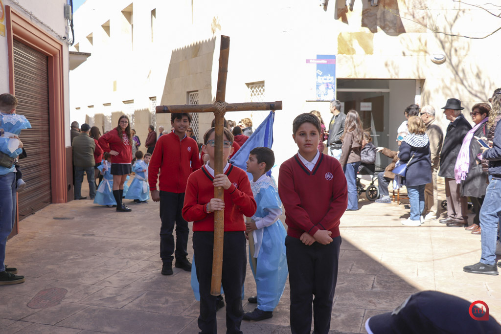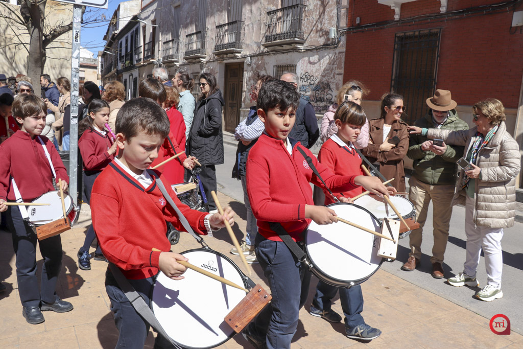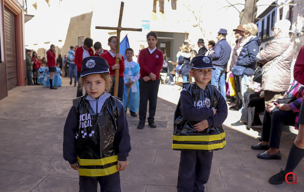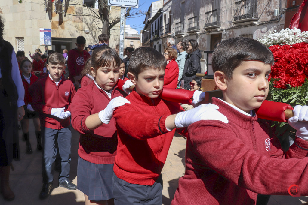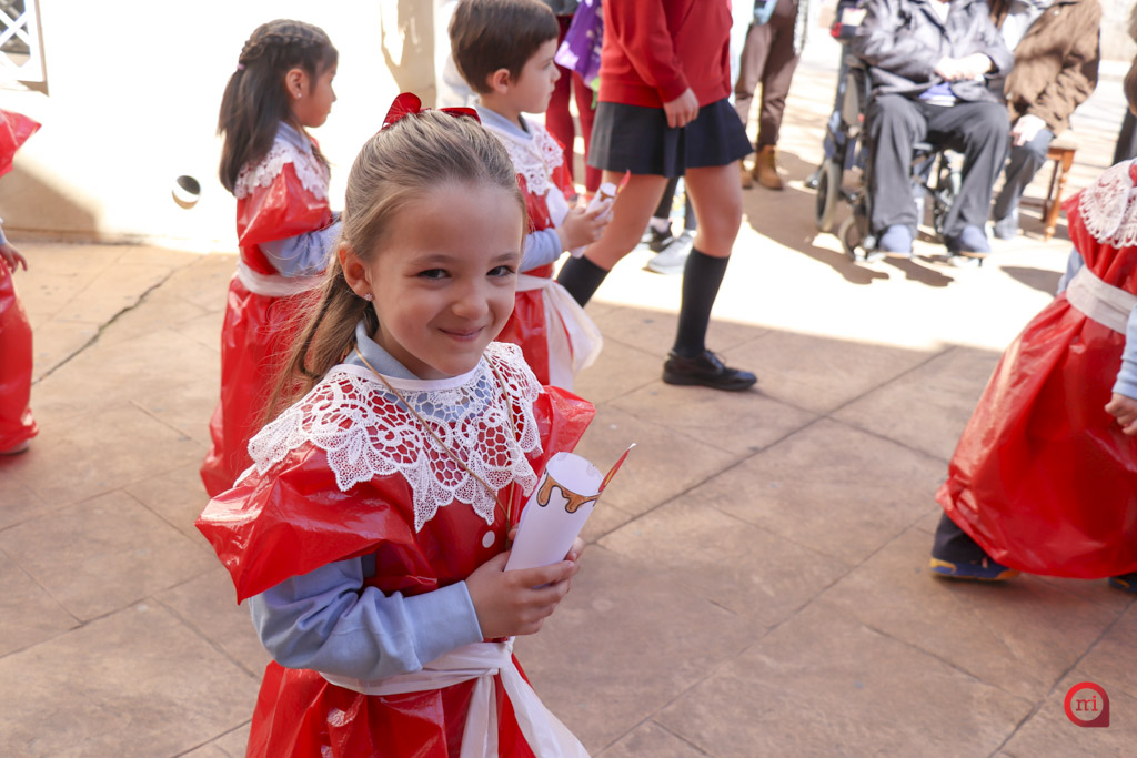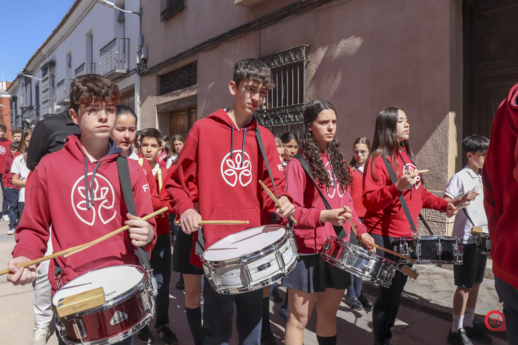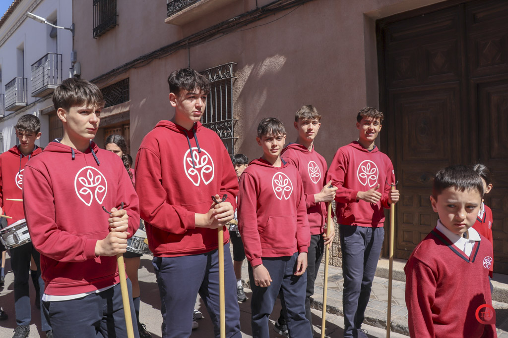 En el desfile, los alumnos de Infantil y de primero y segundo de Primaria hicieron las veces de penitentes, mientras que los de tercero a sexto de Primaria asumieron el papel de costaleros. Por su parte, los estudiantes de tercero de Primaria a segundo de ESO se encargaron del acompañamiento musical con flautas y tambores, coordinando el ritmo y la armonía de la estación penitencial.