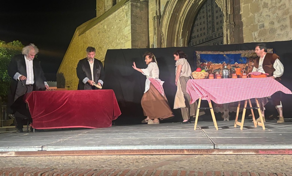 Por la tarde dominical «el ambiente fue multitudinario destacando un acto, precisaba la concejal de Cultura y Festejos, el tirasogas y los bailes de salón que prepararon en la Plaza Mayor la Asociación «La Plaza», actividad que tuvo muchísima acogida de público y que también puso esa nota particular y bonita a estas Jornadas Fadriqueñas.» Y ya próximos a la clausura, llegó otro acto de los que se incardinan en la programación año tras año, el teatro que puso en escena la compañía alcarreña «Escarramán Teatro» y sus «Duelos y quebrantos» un recorrido ácido y cómico sobre las penurias que los pobres escuderos -y aún los hidalgos- pasaban a la hora de comer en los Siglos de Oro. También la obra trató de los excesos culinarios, y de esas delicias que sólo imaginaban y que rara vez cataban. En fin, un entramado que hizo reír al público en otro gran espectáculo de las XV Jornadas Fadriqueñas.