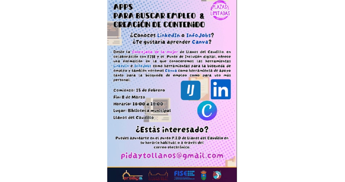 Desde la Concejalía de la Mujer de Llanos del Caudillo, en colaboración con FISE y el Punto de Inclusión digital, se ofrecerá una nueva formación a través de la cual se conocerán las herramientas LinkedIn e InfoJobs para la búsqueda de empleo, además de profundizar en el uso Canva como herramienta de apoyo tanto para la búsqueda de empleo como para uso más personal.