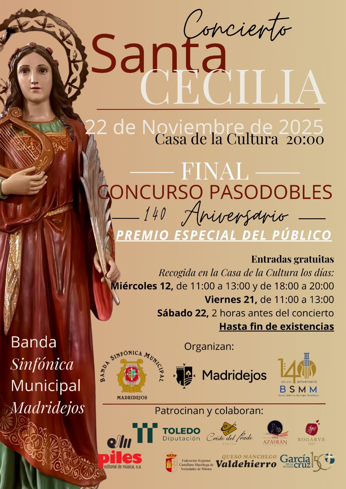 El acto está organizado por la Banda Sinfónica Municipal de Madridejos y el Ayuntamiento, y promete ser una jornada llena de música, participación y homenaje a los compositores, en el marco de las celebraciones de Santa Cecilia.