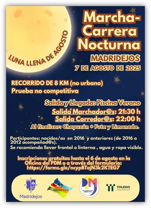 La localidad toledana de Madridejos vivirá una noche muy especial el próximo 7 de agosto, con la celebración de la ya tradicional Marcha-Carrera Nocturna, coincidiendo con la esperada luna llena de agosto.