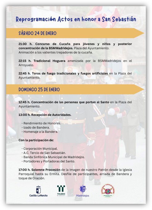 El Ayuntamiento de Madridejos ha oficializado la reprogramación de los actos en honor a San Sebastián debido al luto oficial desde las 00:00 horas del día 20 de enero hasta las 24:00 horas del día 22 de enero.