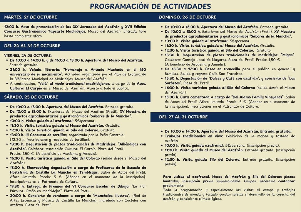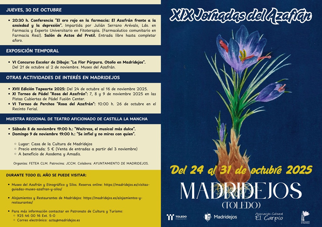 El Ayuntamiento de la localidad toledana de Madridejos ha oficializado una completa programación para las Jornadas del Azafrán, que se desarrollarán del 24 al 31 de octubre.