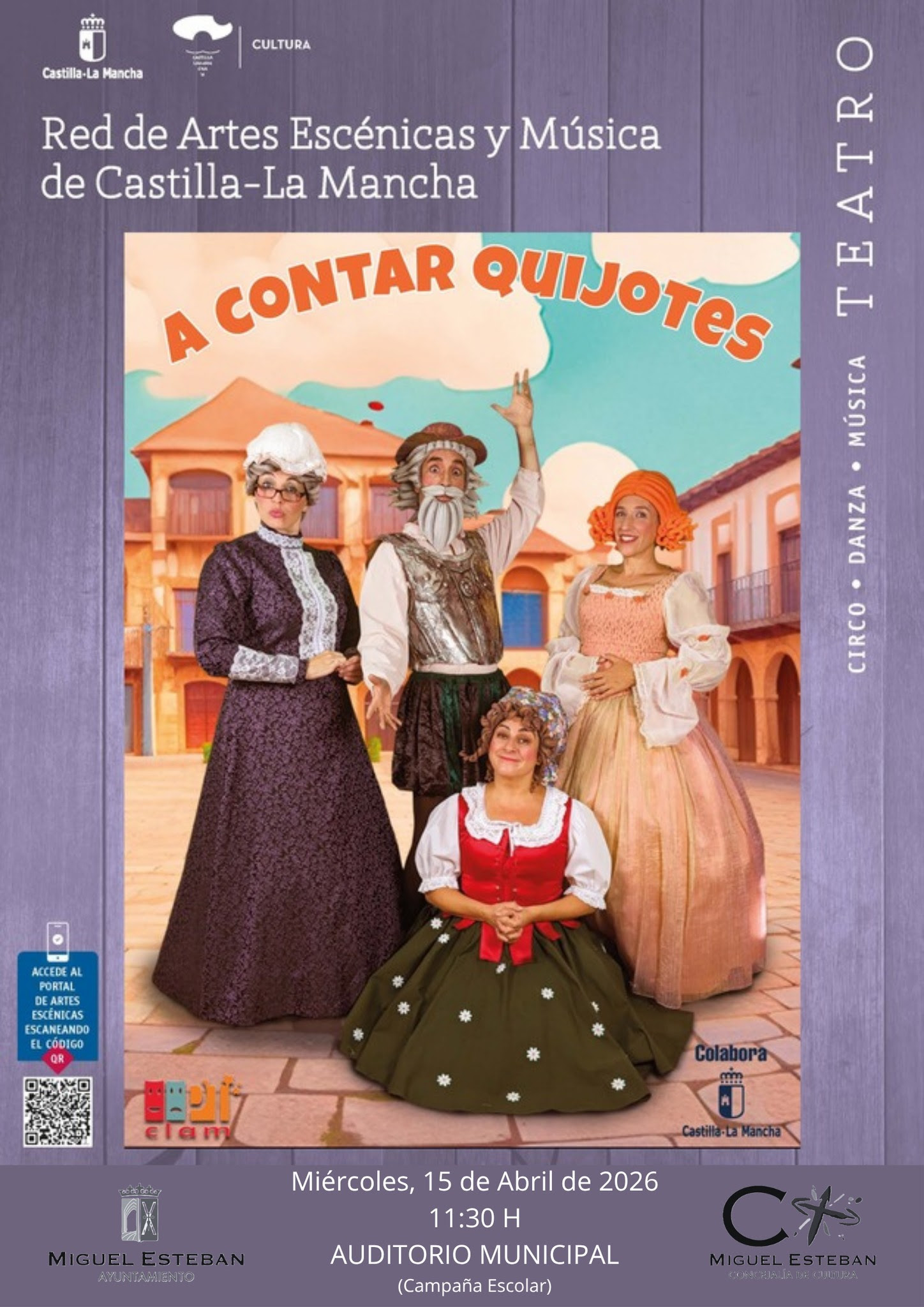 El Auditorio Municipal de Miguel Esteban será escenario el próximo miércoles 15 de abril, a las 11:30 horas, de la representación teatral infantil “A contar Quijotes”, una actividad cultural dirigida al alumnado de Educación Primaria del CEIP Cervantes. La obra, incluida en la programación de la Red de Artes Escénicas y Música de Castilla-La Mancha, propone un acercamiento didáctico y entretenido a la figura de Don Quijote y su mundo, a través de una puesta en escena dinámica que combina interpretación, humor y narrativa adaptada al público infantil.