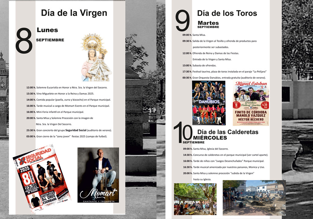 El programa incluye fuegos artificiales, actos religiosos en honor a la Virgen del Socorro, corridas de toros, música en directo y el esperado concierto del grupo Seguridad Social, el 8 de septiembre, entre otras propuestas culturales y de ocio.