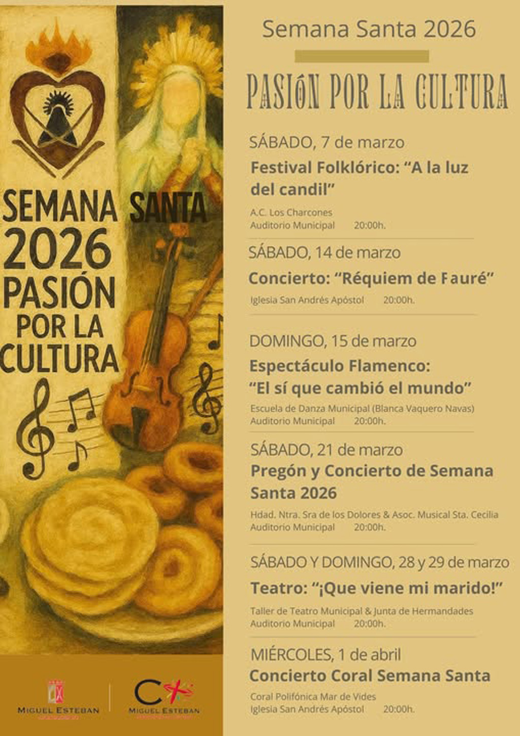 Miguel Esteban volverá a vivir una intensa programación cultural con motivo de la Semana Santa 2026, que este año se desarrollará bajo el lema “Pasión por la Cultura”. Durante el mes de marzo y los primeros días de abril, el municipio acogerá una variada agenda de actividades musicales, escénicas y folclóricas dirigidas a todos los públicos.