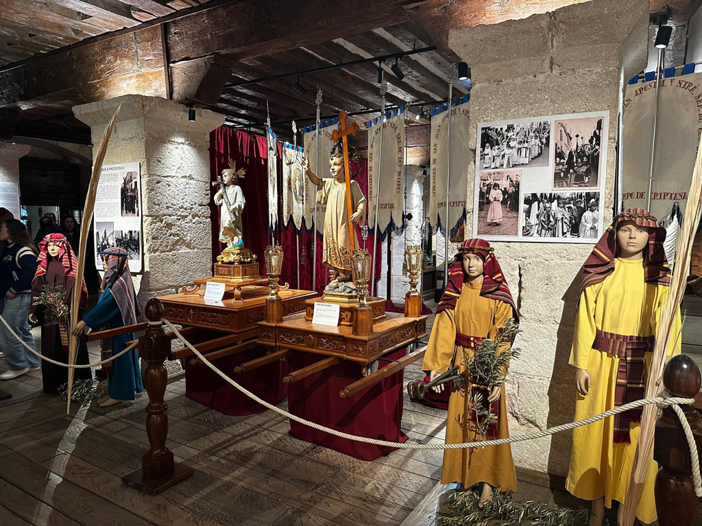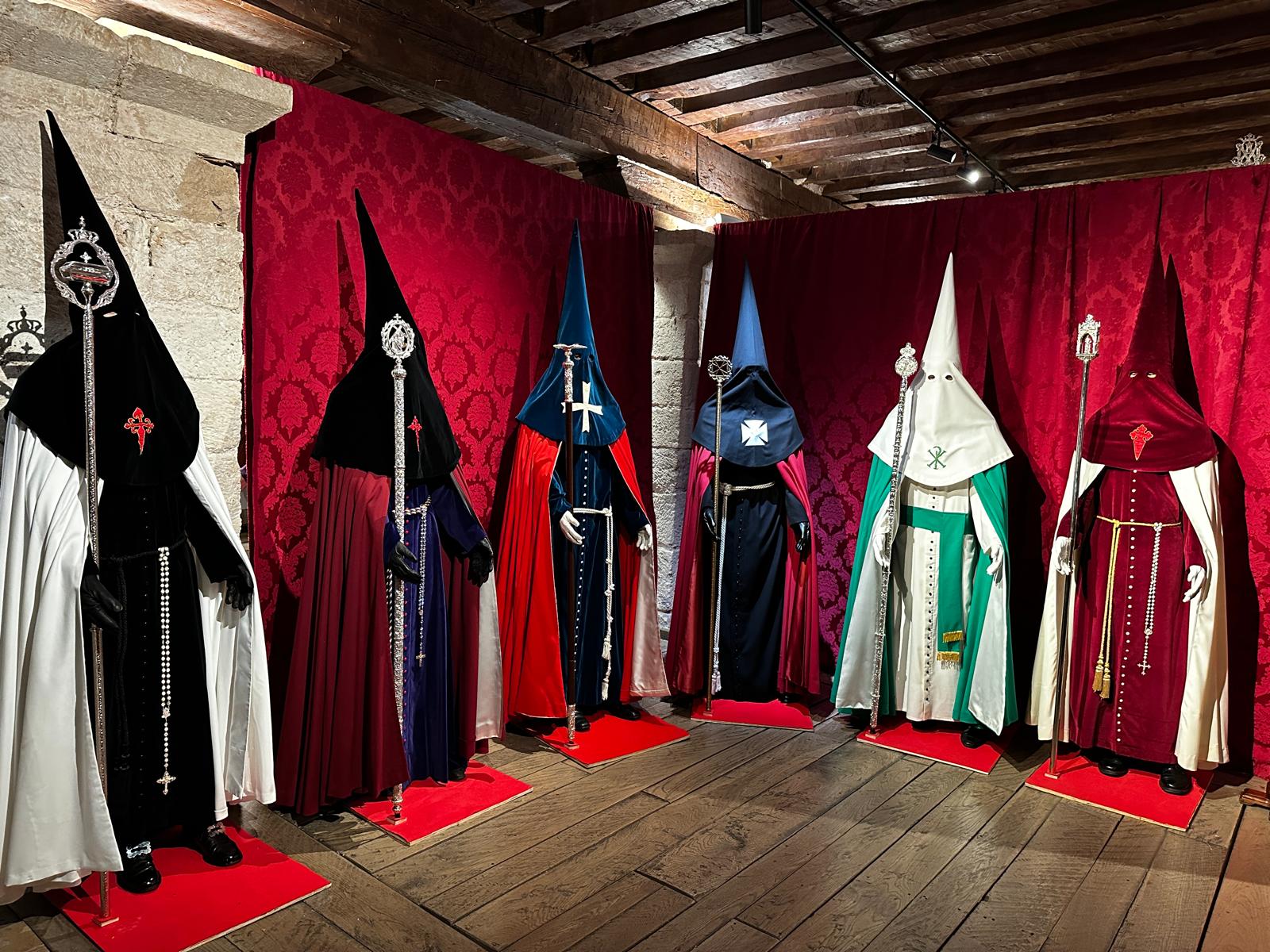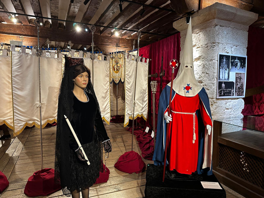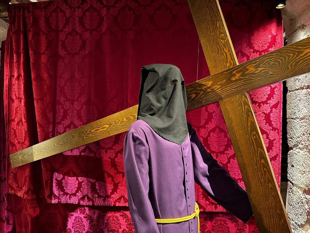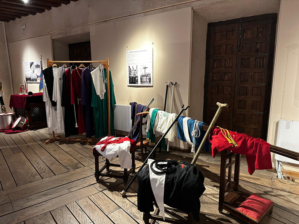 La exposición ofrece un recorrido por los elementos que integran el cortejo procesional, desde enseres y estandartes hasta indumentaria y otros símbolos que forman parte del rico patrimonio cofrade local.