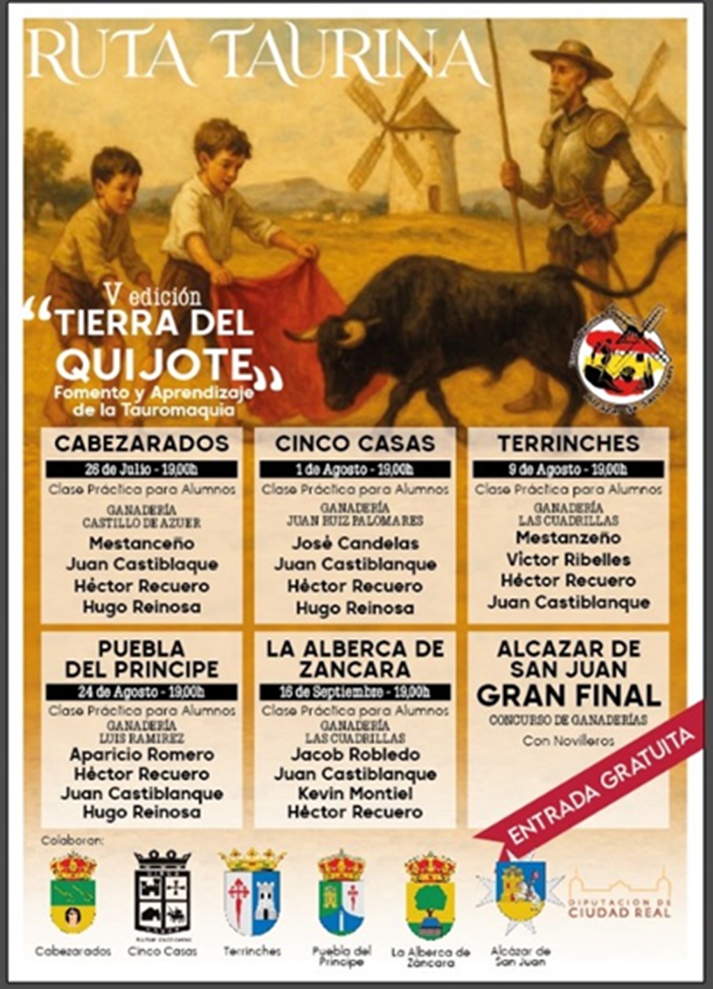 Este martes, 15 de julio, ha sido presentada en el Salón Noble del Ayuntamiento de Alcázar de San Juan la V Ruta Taurina “Tierra del Quijote”, organizada por la Escuela Taurina «El Estoque» de la ciudad, y que contará con hasta seis clases prácticas para distintos novilleros con entrada gratuita. Recorrerá las localidades de Cabezarados, Cinco Casas, Terrinches, Puebla del Príncipe y La Alberca de Záncara, además de una final en Alcázar de San Juan.