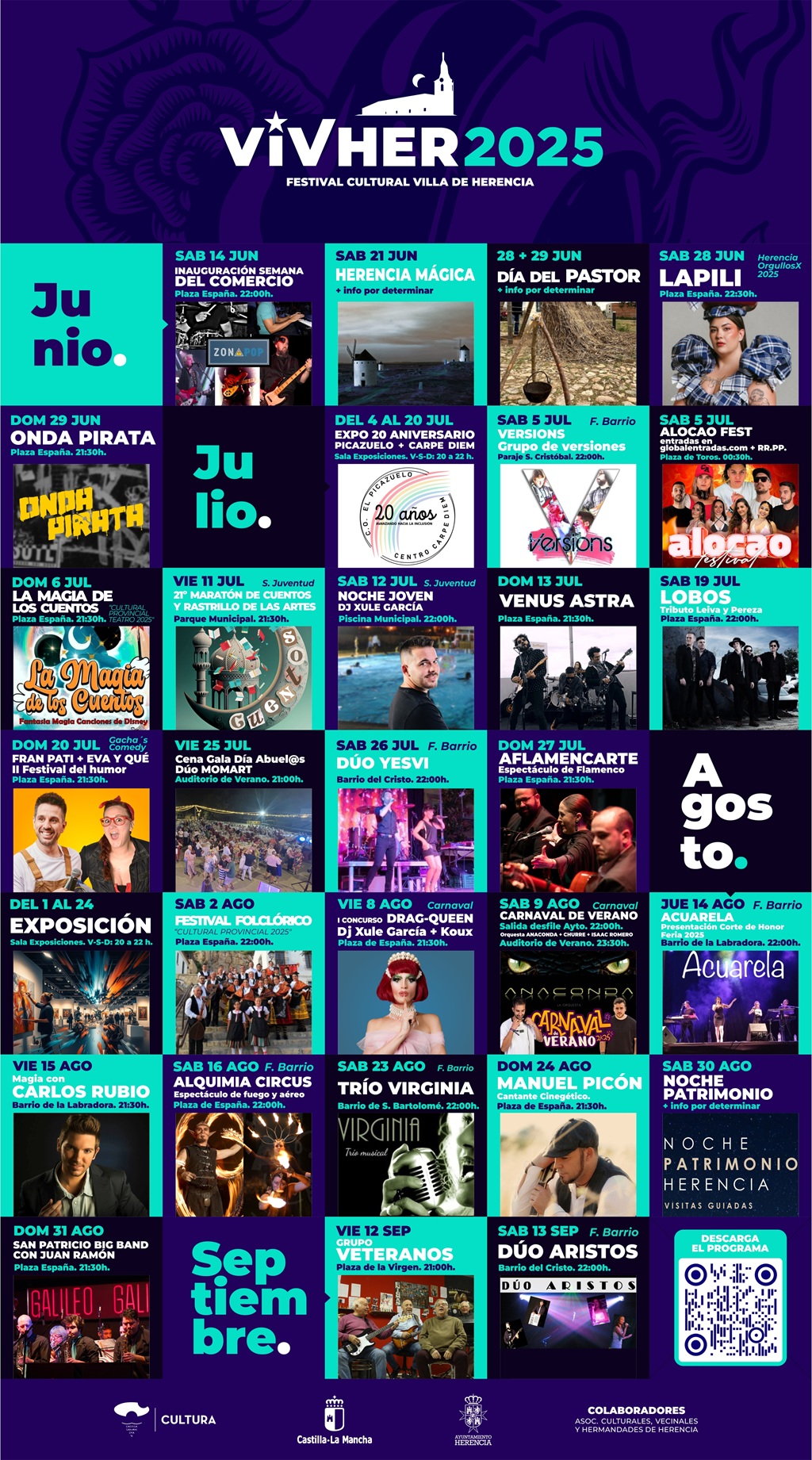 Aunque la inauguración oficial del Vivher tendrá lugar el sábado 28 de junio con los actos del Orgullo LGTBIQ+ y el concierto de la artista emergente ‘LaPili’, desde el próximo sábado 14 de junio y hasta el sábado 13 de septiembre, más de 30 citas te esperan cada semana para sorprenderte y transformar a Herencia, en el corazón de las artes escénicas.