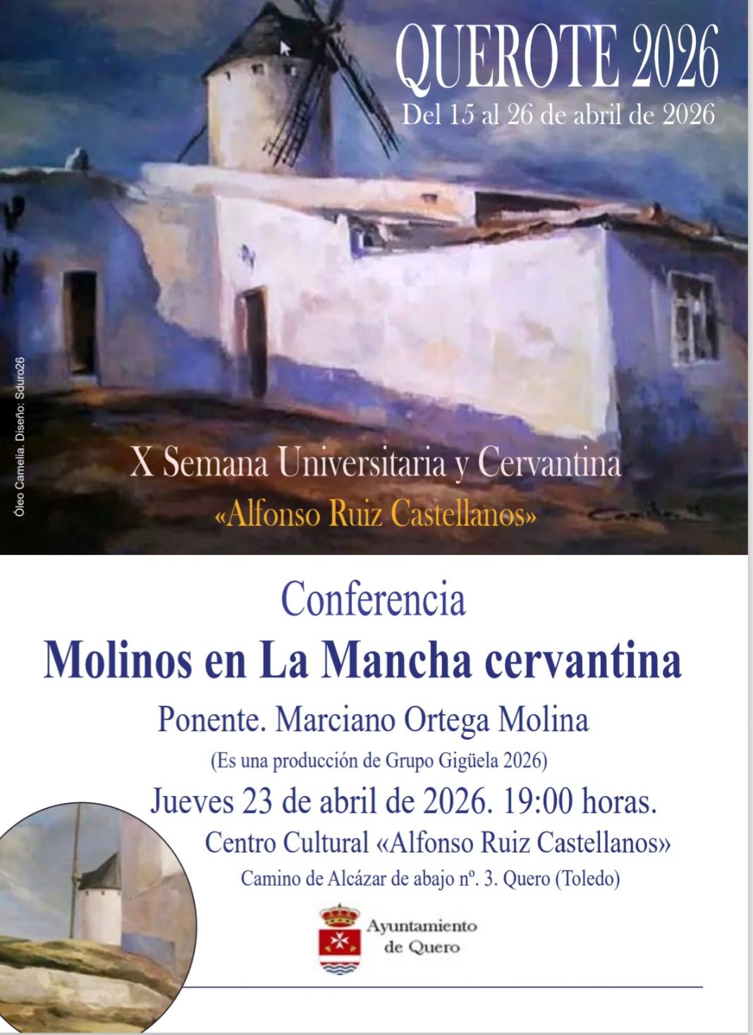 La localidad toledana de Quero celebrará este jueves 23 de abril una nueva actividad enmarcada en la X Semana Universitaria y Cervantina con la conferencia “Molinos en la Mancha Cervantina”, que será impartida por Marciano Ortega.
