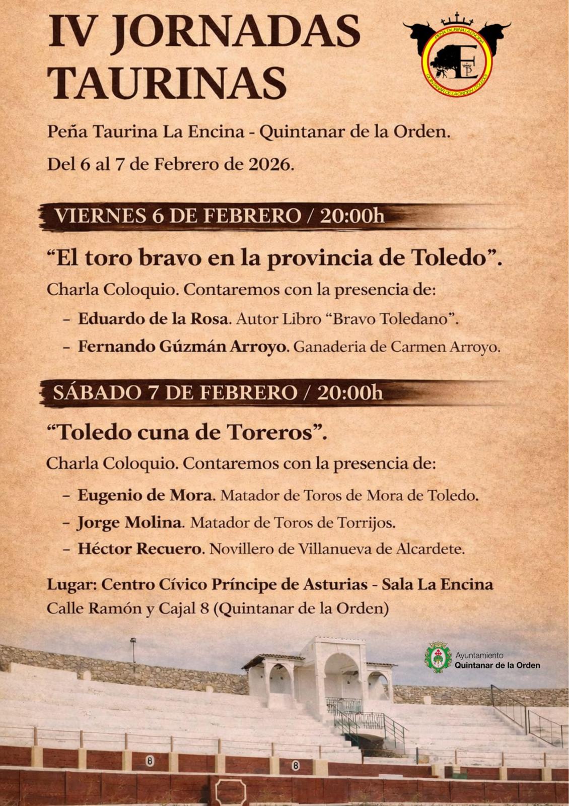 Las ganaderías y los toreros de la provincia de Toledo serán los grandes protagonistas de las IV Jornadas Culturales Taurinas de Quintanar de la Orden, que se celebrarán los próximos viernes 6 y sábado 7 de febrero, organizadas por la Peña Taurina La Encina.