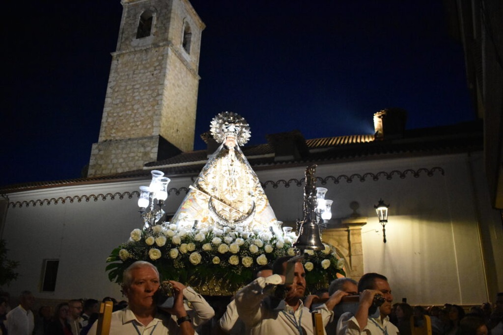 De esta manera, Ntra. Sra. de la Piedad ha sido trasladada por las calles de Quintanar de la Orden, pasando por la Plaza de la Constitución, donde ha tenido lugar de nuevo una sucesión de fuegos artificiales, y llegando al Templo Parroquial, donde, amenizada por el cántico “Dios te Salve María” por parte de la Banda Sinfónica Municipal, entraba por las puertas del Templo Parroquial, donde pasará hasta mañana, que será trasladada en Procesión hasta la Ermita Extramuros.