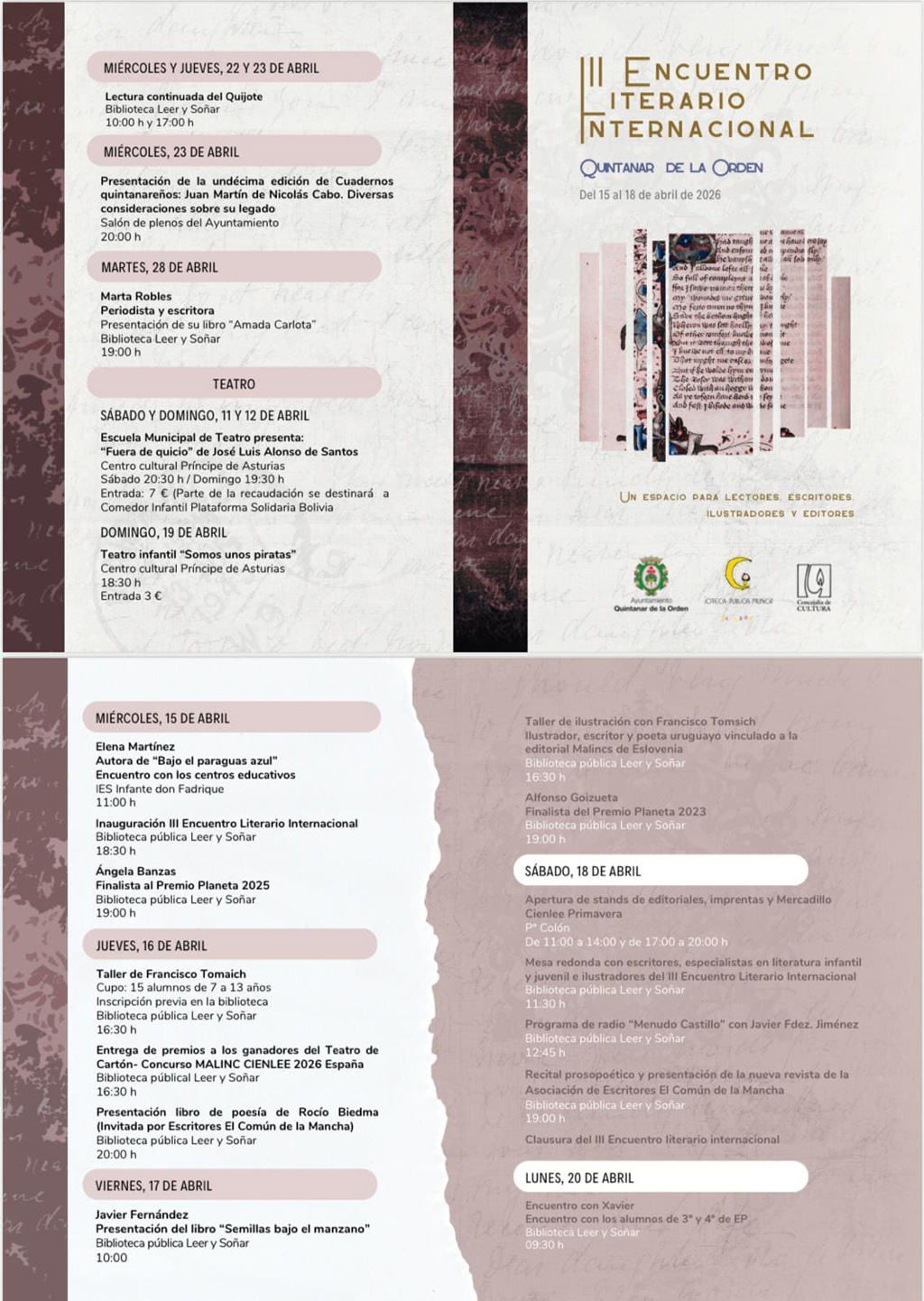 El III Encuentro Literario Internacional de Quintanar de la Orden incluirá una amplia programación cultural que combina presentaciones literarias, recitales, talleres, encuentros con autores y actividades dirigidas al público infantil y juvenil.