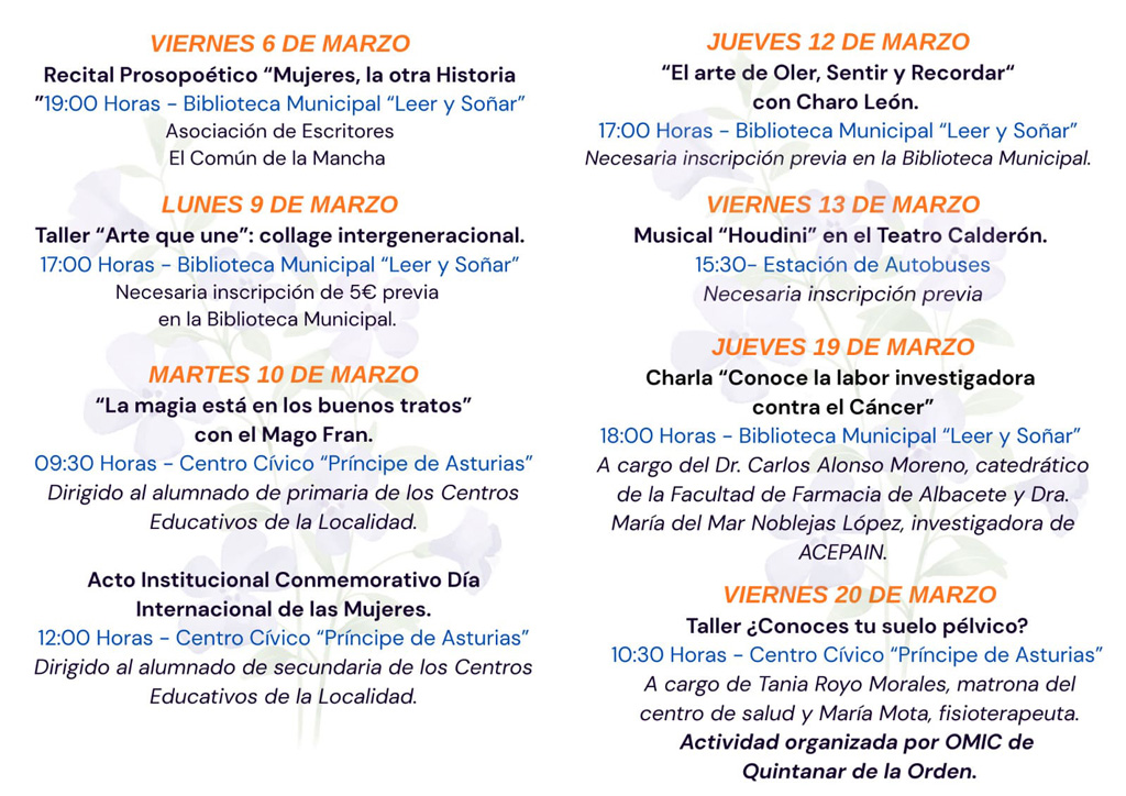Con este programa de actividades por el Día Internacional de la Mujer, el Ayuntamiento de Quintanar de la Orden reafirma su compromiso con la igualdad y la sensibilización social a lo largo del mes de marzo.