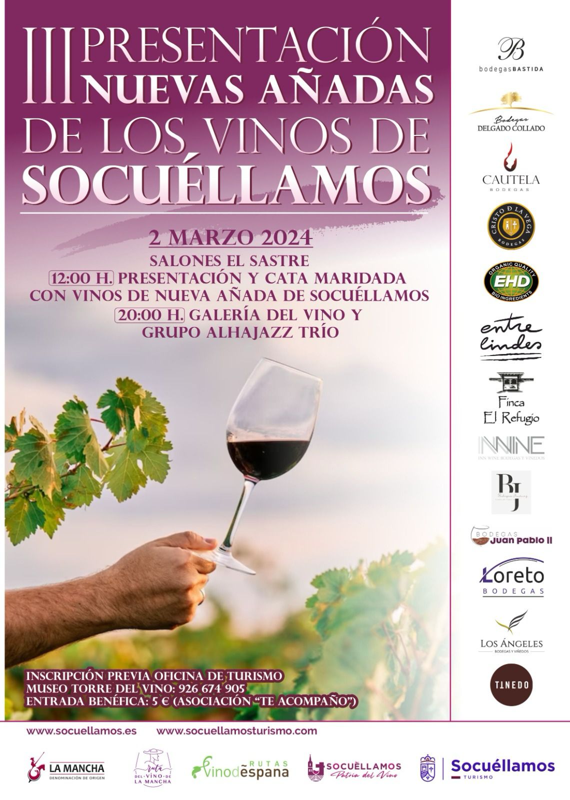 La inscripción previa se realiza en la oficina de Turismo, o en el Museo Torre del Vino de Socuéllamos. La entrada es benéfica, por un precio de 5 euros, dedicada a la asociación “Te Acompaño”. Estos son todos los datos de la cita: