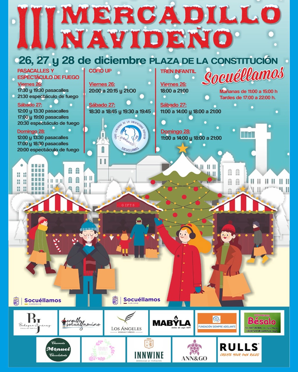 El III Mercadillo Navideño está organizado por las concejalías de Turismo y Comercio y cuenta con la colaboración de Bodegas Jiménez, Orgullo Socuellamino, Bodegas y Viñedos Los Ángeles, Mabyla, Fundación Siempre Adelante, Moda Infantil Bésalo, Churrería Manuel, Lovely Babies, Bodegas y Viñedos Inwine, Ann&Go y Rulls, consolidándose como una cita destacada del calendario navideño local.