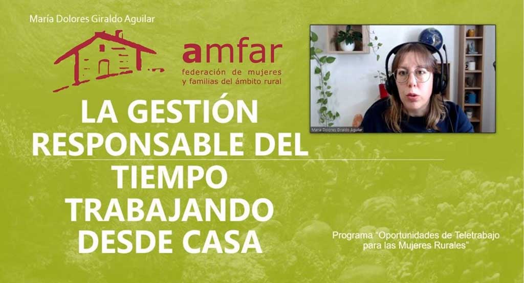 La Federación de Mujeres y Familias del Ámbito Rural (AMFAR) ha impartido hoy la segunda sesión del programa “Oportunidades del Teletrabajo para las Mujeres Rurales” a través de un webinar gratuito en el que se ha abordado “La gestión responsable del tiempo trabajando desde casa”. La sesión ha sido impartida por la pedagoga y experta […]